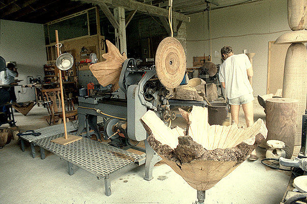 Front Studio, Quincy, FL (circa 1988). Mark's oldest son Ben (who works in the computer business and is a painter) sweeping and straightening studio. The "Platform lathe" is a modified machine lathe, custom built by Mark (and friends), in 1982, in Henniker, NH.